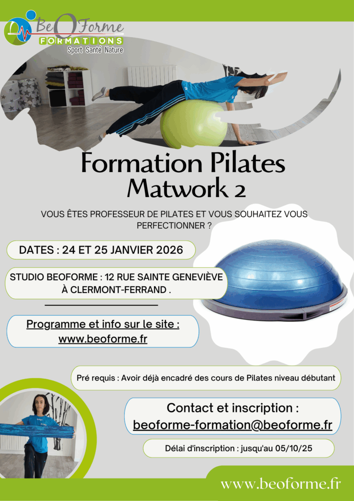 Si vous souhaitez vous perfectionner en tant que professeur de Pilates, participer à la formation Matwork 2. Info supplémentaires : https://www.beoforme.fr/wp-content/uploads/2025/02/Programme-de-Formation-Pilates-2024-Matwork-2-detaille.pdf Inscription par mail à l’adresse suivante : beoforme-formation@beoforme.fr